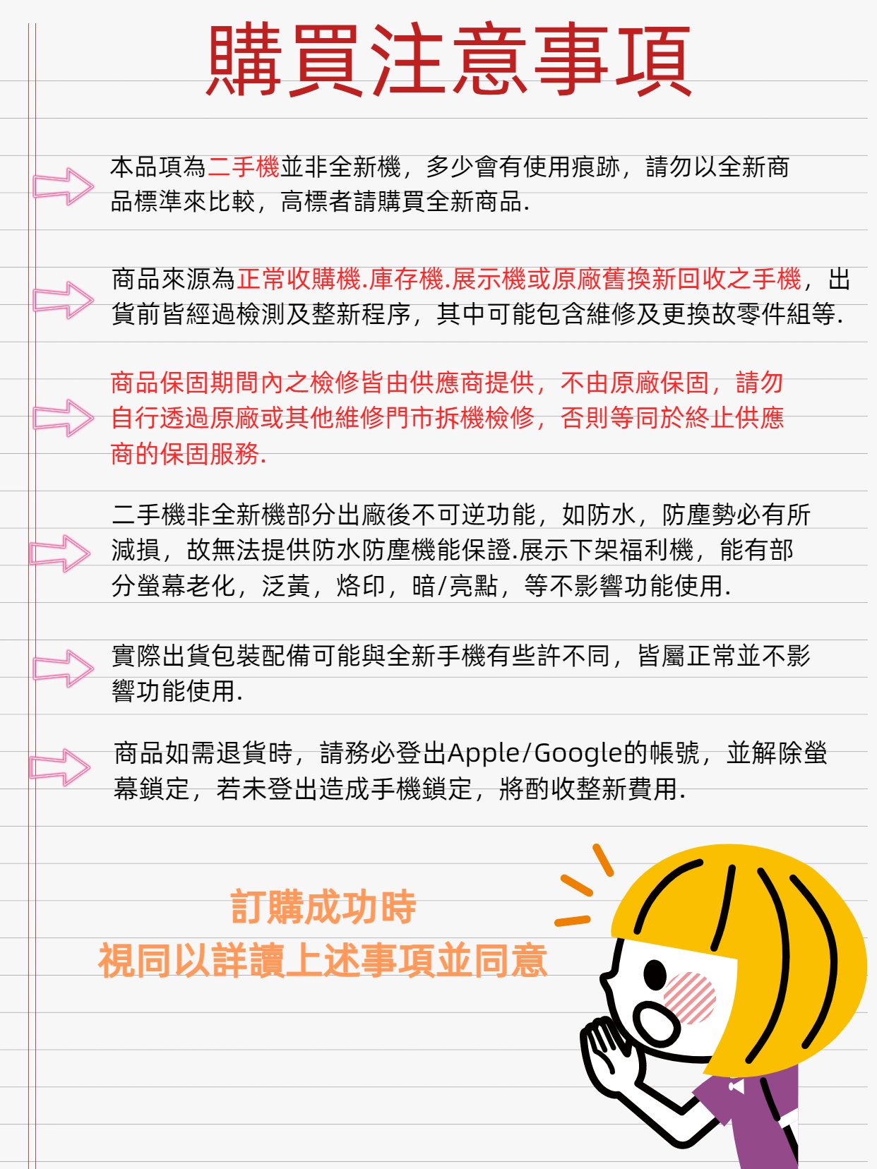 1.如需辦理退貨,務必先將Apple/Google等帳號登出,否則將會導致商品鎖機無法使用,此情況為人為疏失將酌收部分維修費用。